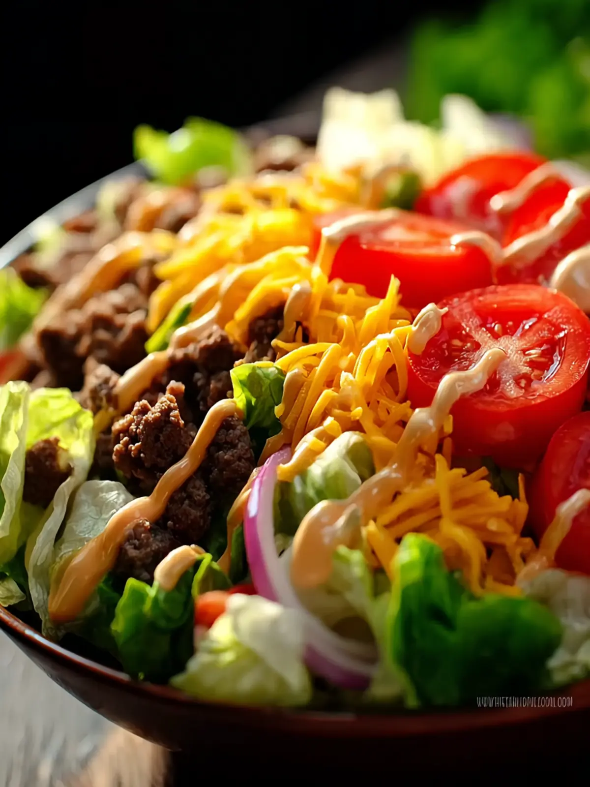 A delicious salad inspired by the famous Big Mac, featuring ground beef, fresh veggies, and a special sauce.