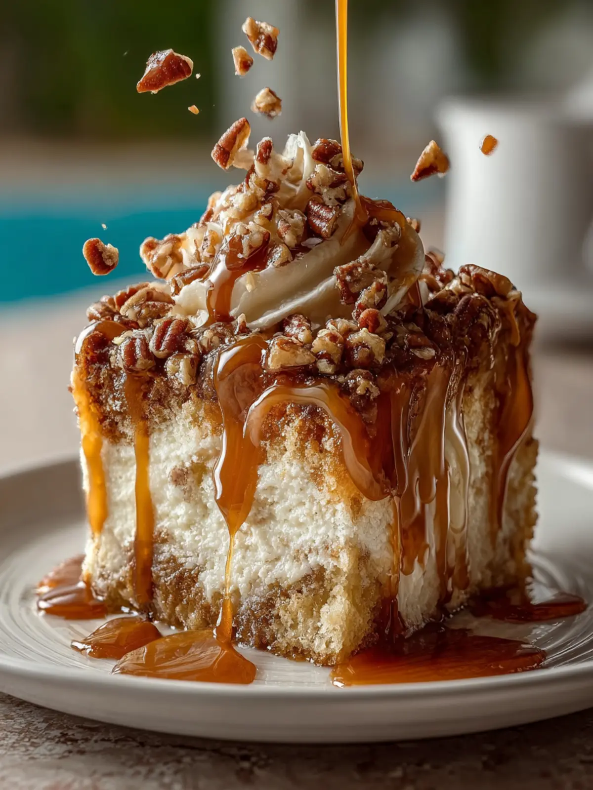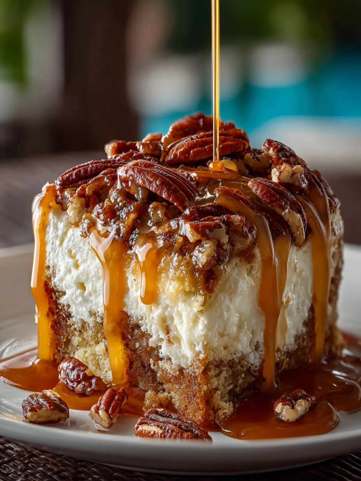 Creamy Praline Sauce: The drizzle of praline sauce over the cake serves as the finishing touch, adding a glossy sheen that teases your taste buds. The richness of this sauce complements the texture of the cake and pecans, tying the dish together perfectly.