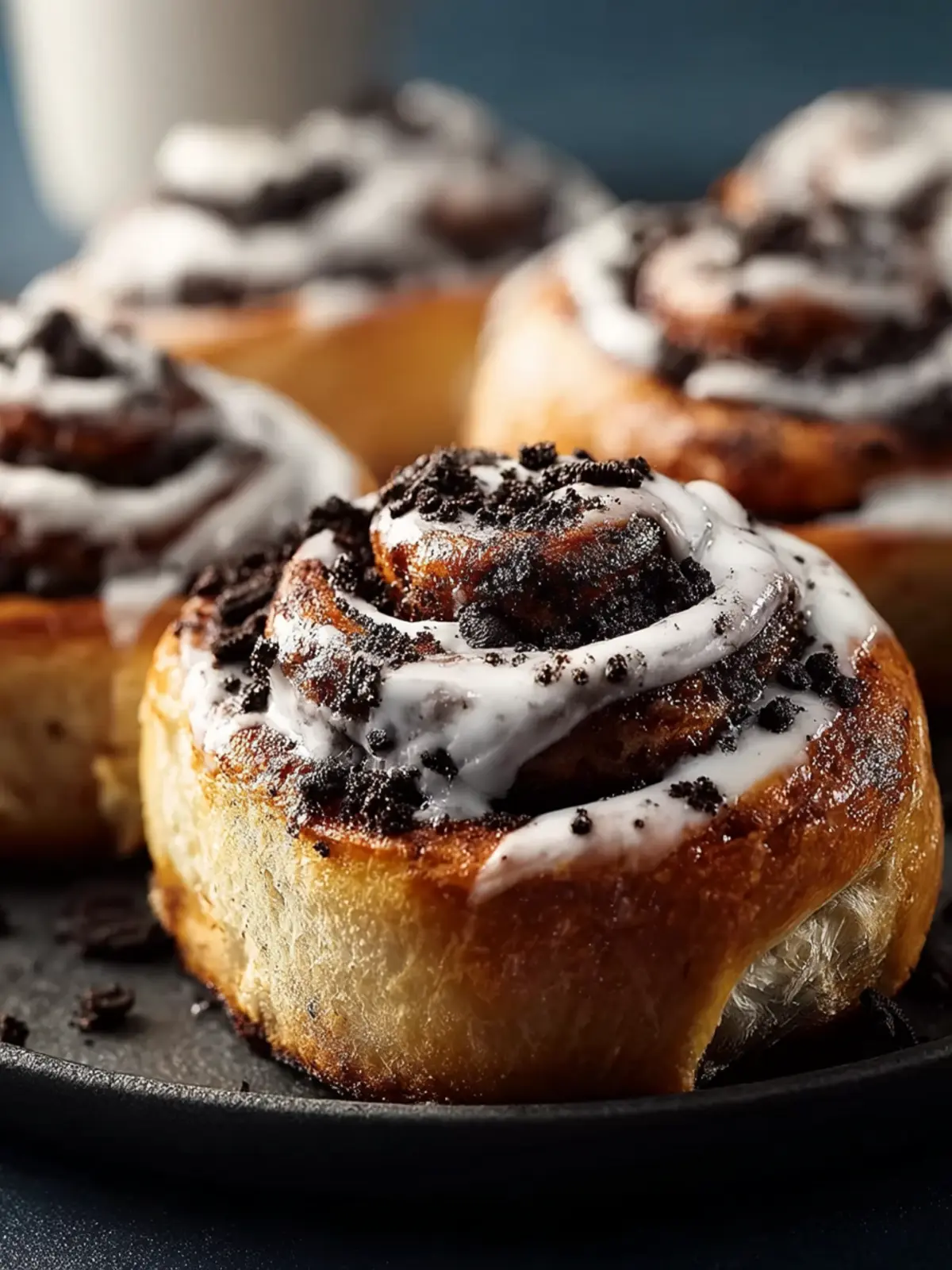 Delicious cinnamon rolls topped with a creamy frosting and crushed chocolate cookies, perfect for any occasion.