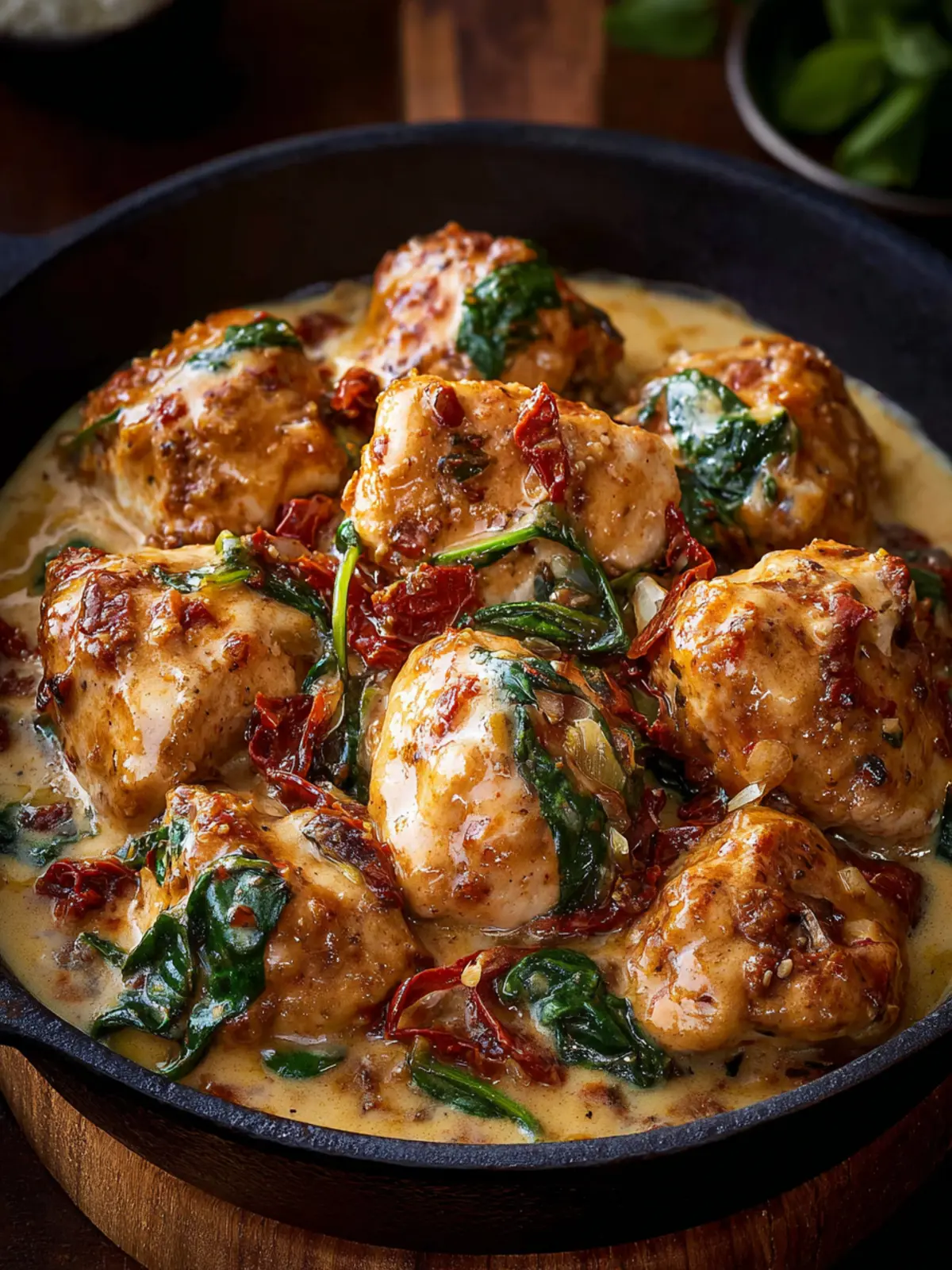 These bites aren’t just another chicken dish; they’re a celebration of flavors and textures. Each piece of chicken is tender and juicy, coated in a luscious cream sauce enriched with sun-dried tomatoes, beautiful wilted spinach, and a hint of garlic—what’s not to love? The vibrant colors and inviting aroma make them perfect for sharing with friends or serving at your next get-together.