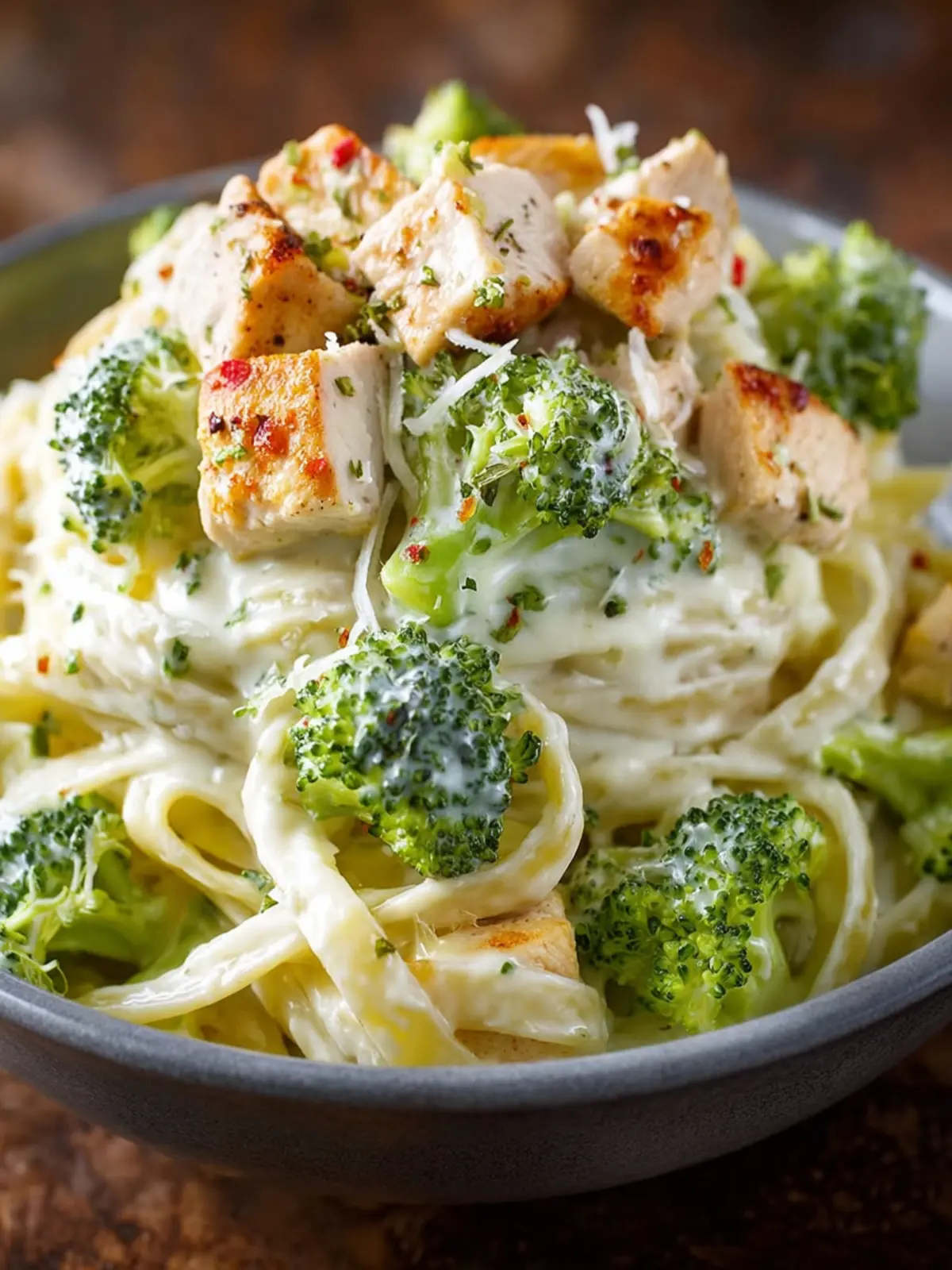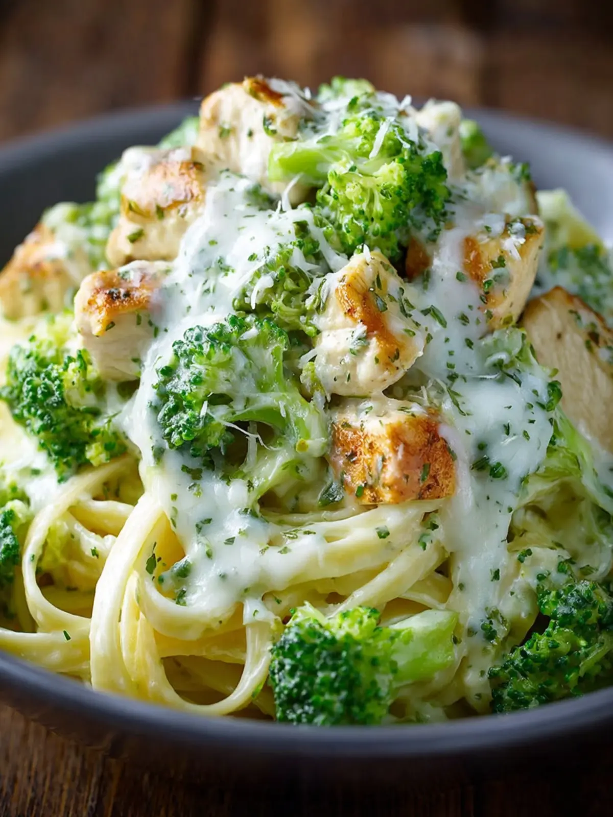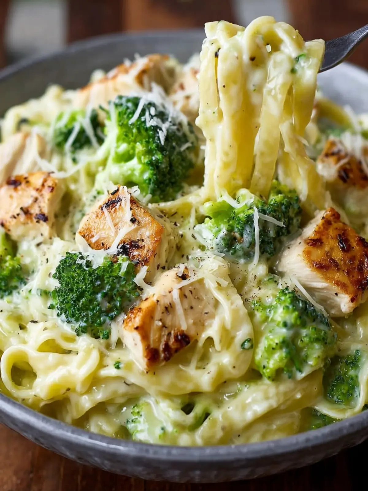 A delicious creamy pasta dish featuring tender chicken and fresh broccoli!