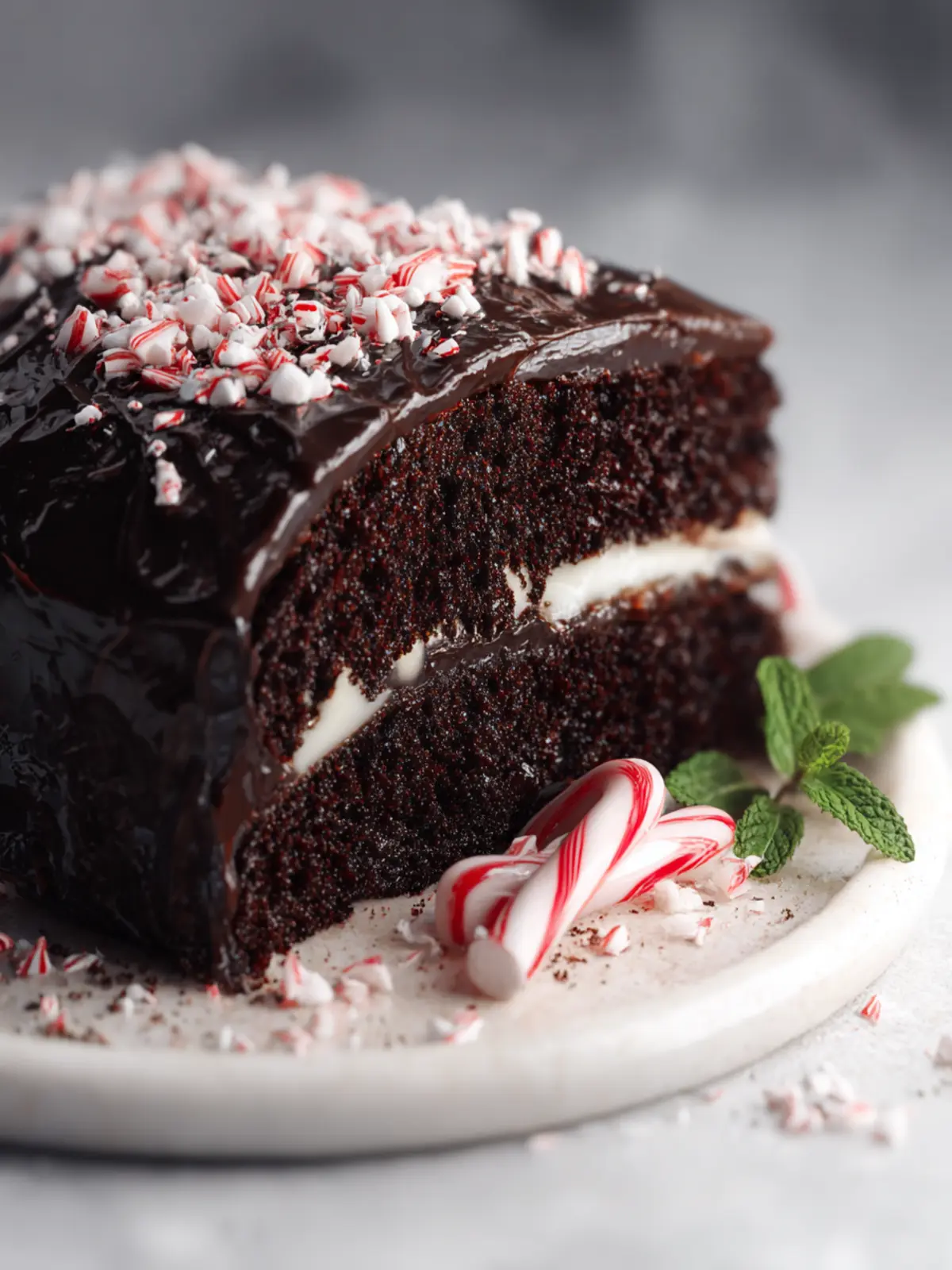 A delicious peppermint chocolate cake topped with fluffy peppermint frosting and chocolate ganache.