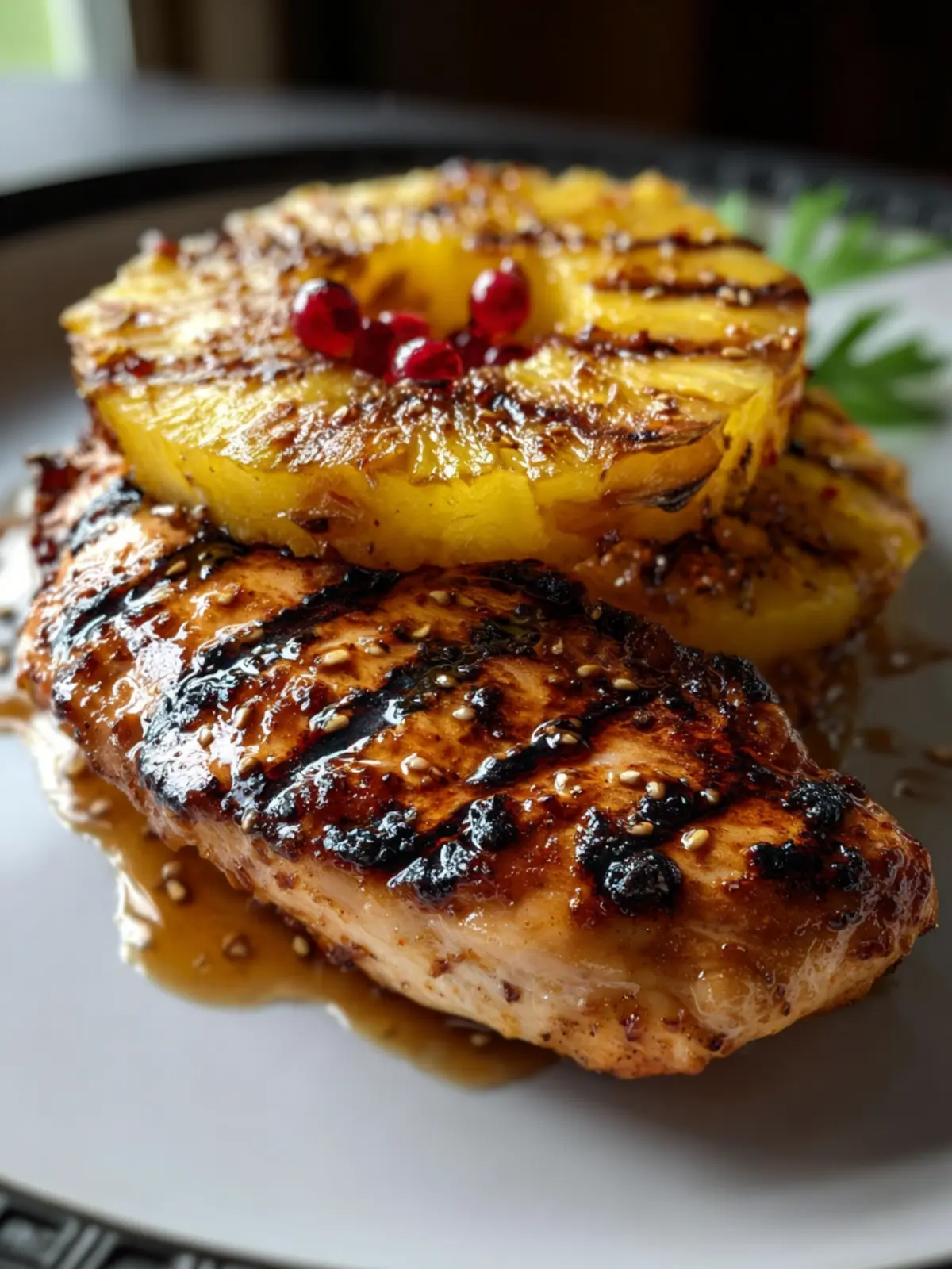 - Serve chicken with grilled pineapple on top.