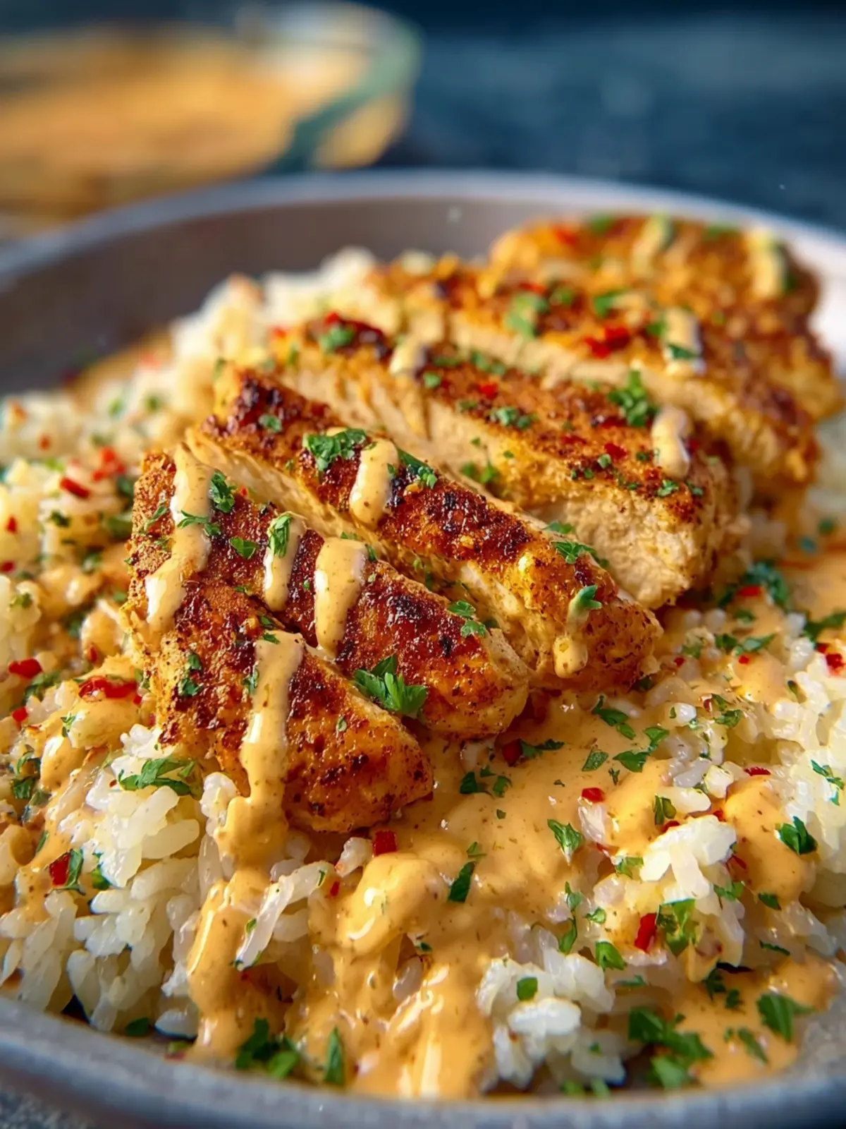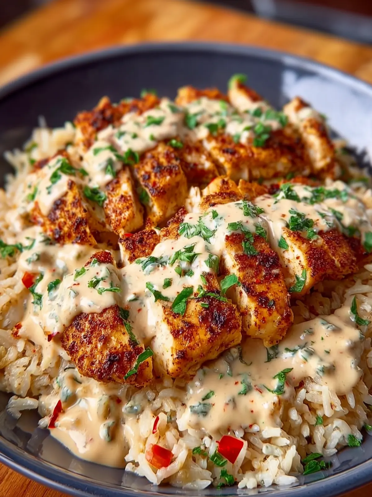 - Layer the Cajun rice on a plate, top with sliced chicken, and drizzle with creamy sauce. Garnish with fresh parsley.