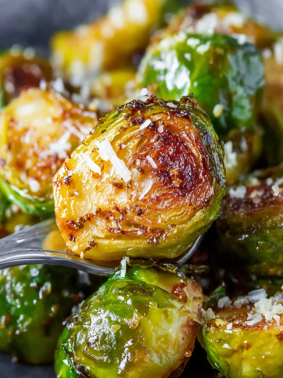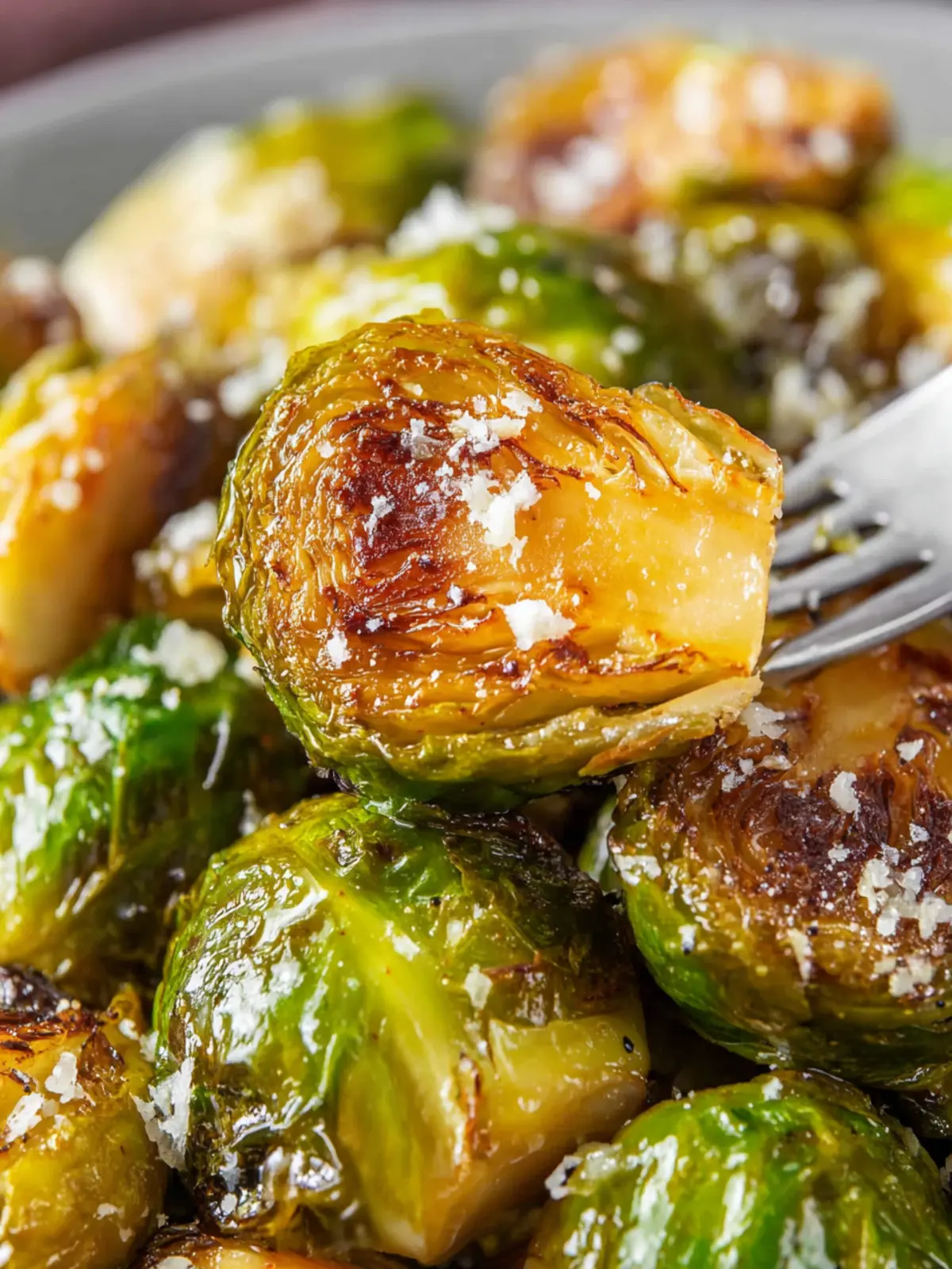 Delicious roasted Brussels sprouts with olive oil and Parmesan cheese.