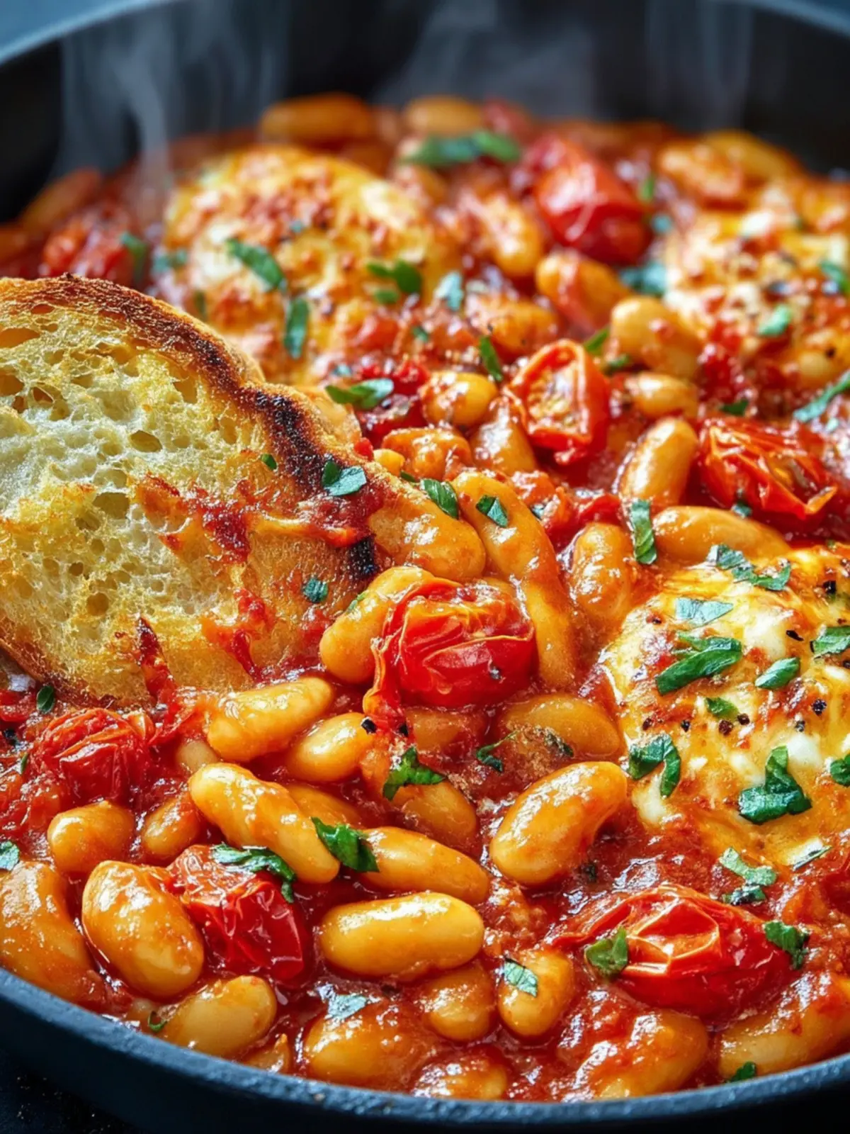 - Finish and serve: Remove from the oven and add 1 handful fresh basil on top. Serve warm with 4 slices crusty bread to scoop up the saucy beans and melted cheese.