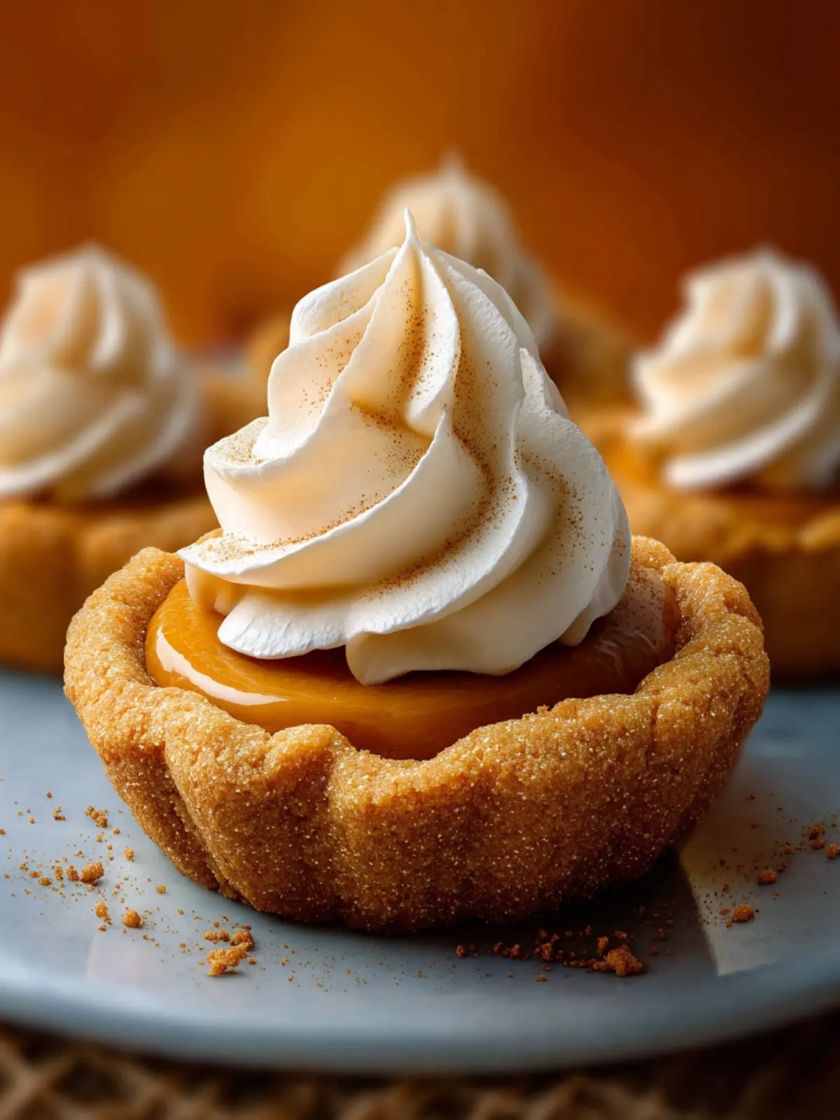 Delicious mini cookies filled with a creamy pumpkin filling and topped with whipped cream and cinnamon.