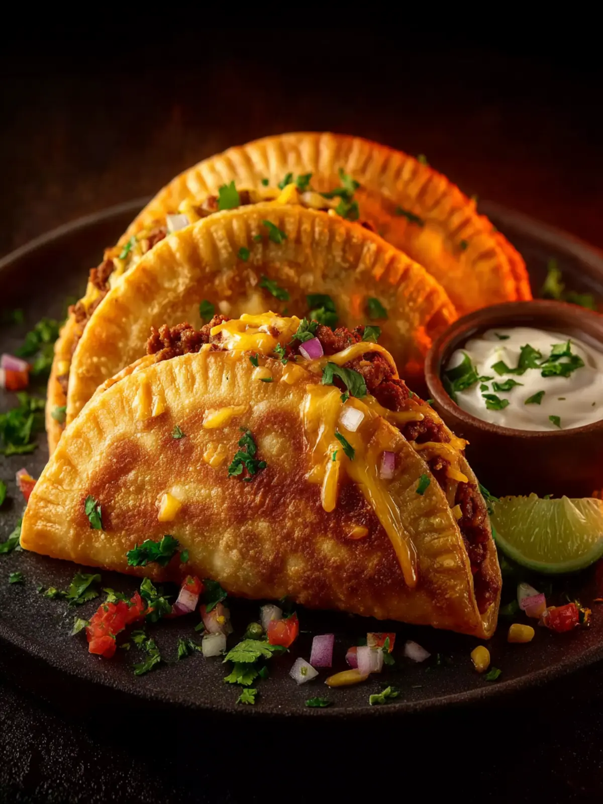 Delightful taco pockets filled with seasoned meat, cheese, and veggies, perfect for a snack, appetizer, or main course.