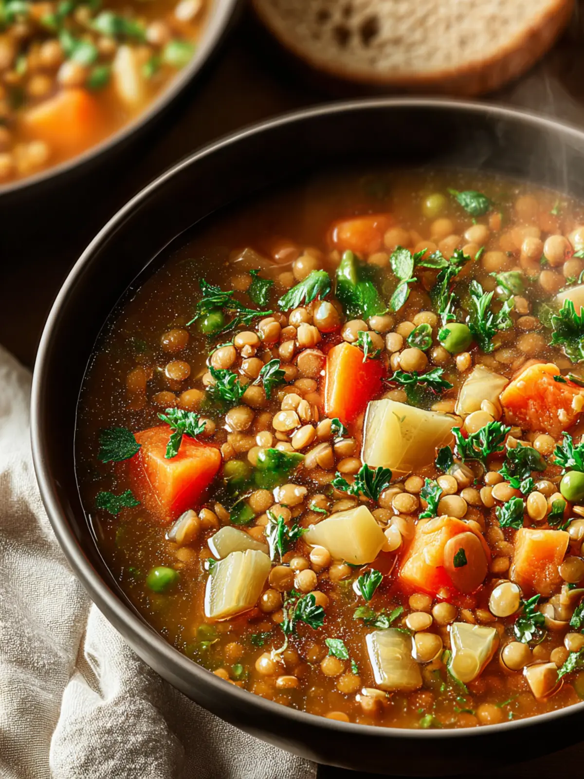 A nourishing soup made with pearl barley and lentils, perfect for a warm meal.